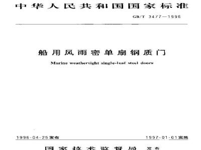 本标准规定了船用风雨密单扇钢质门的产品分类,技术要求,试验方法,检验规则和标志等。本标准适用于各类船舶干舷甲板以上的上层建筑及甲板室出入口使用的门。 GB/T 3477-1996 船用风雨密单扇钢质门 GB/T3477-1996 标准下载解压密码:www.bzxz.net
