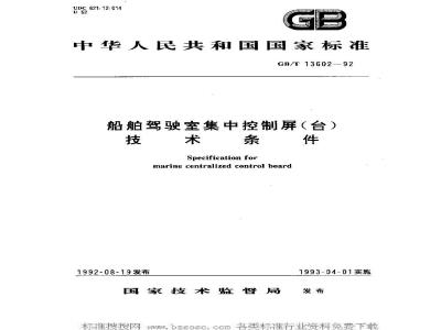 本标准规定了船舶驾驶室集中控制屏(台)的分类、技术要求、试验方法、检验规则以及标志、包装、运输贮存等。本标准适用于各种类型船舶驾驶室中的航行灯、信号灯、闪光灯、雾笛、报警等控制单以及对雷达显示器、渔探仪显示器、操舵仪、测深仪、扩音机、声力电话、甚高频无线电话、气象仪、计程仪、磁罗经、传令钟、主机遥控装置进行集中控制的驾控屏。 GB/T 13602-1992 船舶驾驶室集中控制屏(台)技术条件 GB/T13602-1992 标准下载解压密码:www.bzxz.net