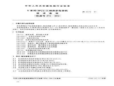 本标准规定了电动机的型式,基本参数与尺寸,技术要求,检验规则以及标志和包装的要求。本标准适用于Y系列(IP23)机座号315~355的笼型转子一般用途三相异步电动机(以下简称电动机)。凡在本系列基础上派生的品种,也可参照执行。2引用标准