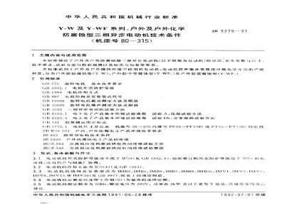 本标准规定了户外及户外附腐蚀型三相异步电动机的型式、基本参数与尺寸、技术要求、试验方法与检验规则以及标志与包装等要求。 本标准适用于户外及户外腐蚀环境中使用的电动机,电动机按所能承受使用环境化学介质的严酷程度,分为户外防轻腐蚀型(Y-W),户外防中等腐蚀型(Y-WF1)及户外防强腐蚀型(Y-WF2)。 JB/T 5275-1991 Y-W 系列及Y-WF系列 户外及户外化学防腐蚀型三相异步电动机技术条件( 机座号80~315) JB/T5275-1991 标准下载解压密码:www.bzxz.net