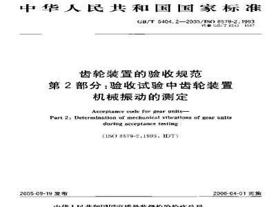 GB /T 6404的本部分适用于具有独立箱体的闭式增速和减速齿轮装置机械振动的测定。规定了箱体和轴振动的测定方法以及测定振动级的仪器类型、测量方法和测试步骤。包括了验收中的振动等级。 GB/T 6404.2-2005 齿轮装置的验收规范 第2部分:验收试验中齿轮装置机械振动的测定 GB/T6404.2-2005 标准下载解压密码:www.bzxz.net