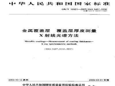 本标准规定了应用X射线光谱方法测量金属覆盖层度的方法。本标准所用的测量方法基本属于测定单位面积质量的一种方法。如果已知覆盖层材料的密度,则测量结果也可用覆盖层的线性厚度表示。本测量方法可同时测量三层覆盖层体系,或同时测量三层组分的厚度和成分。给定覆盖层材料的实际测量范围主要取决于被分析的特征X射线荧光的能量以及所允许的测量不确定度,而且因所用仪器设备和操作规程而不同。 GB/T 16921-2005 金属覆盖层 覆盖层厚度测量 X射线光谱方法 GB/T16921-2005 标准下载解压密码:www.bzxz.net