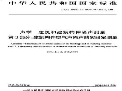 G/T1988声学华筑和理筑齿件附测量分为:一:-第1部分间传产受抑制约实验通试该旅要求!·第部分:数据精需度的确定,验证和应用:一第3部分:注的构件空气六隔声的实验幸测量:弟4部分:房训之间空气声两声的现所测些:第5部分,外墙购件和外略空气户统产的现测..第部分:楼板撞击声两声的实验室测量!一第7部分:楼板搅击声将产的现场测过:GB/T19889.3—-2005/15O 140-3;1995一·第部分,三质标准愁板层控市产改并量的实验案测量!年部为GT19的第部。