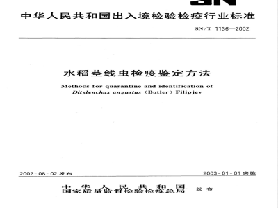 本标准规定了对水稻茎线虫检疫和鉴定方法。SN/T1136—2002