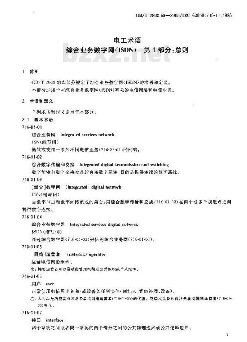 中文名称:电工术语 综合业务数字网(ISDN) 第1部分:总则