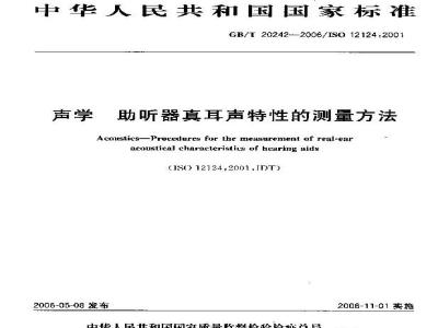 CB/I20242—2006/15012124.2001声学助听器真耳声特性的测量方法标准现守了的斯据贞再凸对性必测量方法和要求,口的是为在按所本标准所述的方法和采用符合1E166多求的设各的录件下,保证对给定的按际和人耳所作的测量有基立相同的结果。期听器点开声得性药划量,采用升线性的点分析处圳的技术给果只效所用的漫试倍号和测试条件必:测且应按服助听盟到追的建设运行因必制造前可能要求使用本标准定以外的特殊的测试或件,