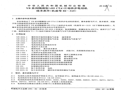 本标准规定了YB系列隔爆型(dIICT4)三相异步电动机的型式、基本参数与尺寸、技术要求、试验方法与检验规则及标志与包装的要求。本标准适用于YB系列隔爆型(dIICT4)三相异步电动机(机座号80~315)(以下简称电动机)。凡属本系列电动机派生的各种系列电动机也可参照执行。本系列电动机防爆性能符合GB3836.2的规定,制成隔爆型。防爆标志为dIICT4,适用于工厂dIIC级,温度组别为T1T4组的可燃性气体或蒸气与空气形成的爆炸性混合物的场所。2