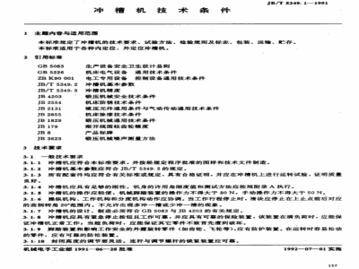 3.1.1冲槽机应符合本标准要求,并按经规定程序批准的图样和技术文件制造、3.1.2冲槽机基本参数应符合JB/T5349.2的规定。3.1.3所有配套件均应符合有关标准或规定,具有合格证明,并应在冲槽机上进行运转试验,证明质量良好。