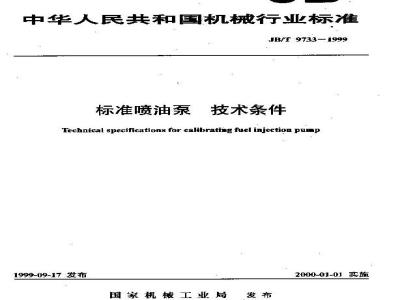 JB/T 9733-1999 本标准是对 ZB J94 015-90《标准喷油泵 技术条件》的修订,主要技术内容改变如下: ——标准泵型有所增加; ——完善了高压油管组件应符合的规定。 本标准规定了标准喷油泵的型式,主要参数,技术要求和试验方法。 本标准适用于校核喷油泵试验台用标准喷油器总成的标准喷油泵。 本标准于 1980 年以 NJ 200-80 首次发布,于 1990 年 6 月 20 日第一次修订为 ZB J94 010-90。 JB/T 9733-1999 标准喷油泵 技术条件 JB/T9733-1999 标准下载解压密码:www.bzxz.net