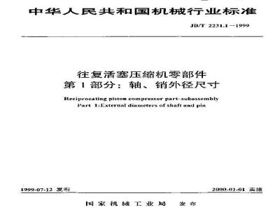 JB/T 2231.1-1999 本标准是对 JB 2230-86《往复活塞压缩机 轴销外径尺寸》进行的修订,修订时仅作了编辑性修改,主要技术内容没有变化。 本标准是 JB/T 2231《往复活塞压缩机零部件》系列标准的第 1 部分,该系列标准包括以下 5 个独立组成部分: JB/T 2331.1:轴、销外弃尺寸 JB/T 2331.2:气缸直径 JB/T 2331.3:薄壁轴瓦 JB/T 2331.4:环状阀片 JB/T 2331.5:气阀安装尺寸 本标准规定了往复活塞压缩机主要零部件轴、销的外径尺寸。 本标准主要适用于往复活塞压缩机主轴颈、曲柄销、十字头销、活塞销和活塞杆等零件。 本标准于 1977 年首次发布,1986 年第 1 次修订,本次是第二次修订。 JB/T 2231.1-1999 往复活塞压缩机零部件 第 1 部分:轴、销外径尺寸 JB/T2231.1-1999 标准下载解压密码:www.bzxz.net