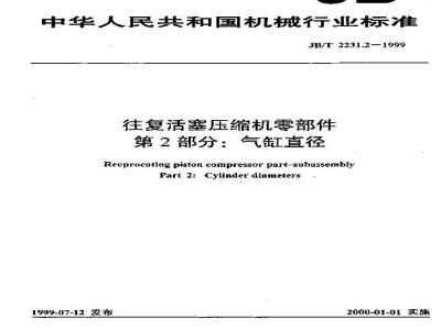 JB/T 2231.2-1999 本标准是对 JB 2231-86《往复活塞压缩机 气缸直径》进行的修订,修订时仅作了编辑性修改,主要技术内容没有变化。 本标准是 JB/T 2231《往复活塞压缩机零部件》系列标准的第 2 部分,该系列标准包括以下 5 个独立组成部分: JB/T 2331.1:轴、销外弃尺寸 JB/T 2331.2:气缸直径 JB/T 2331.3:薄壁轴瓦 JB/T 2331.4:环状阀片 JB/T 2331.5:气阀安装尺寸 本标准规定了往复活塞压缩机的气缸直径尺寸。 本标准适用于往复活塞压缩机。 本标准于 1977 年首次发布,1986 年第 1 次修订。 JB/T 2231.2-1999 往复活塞压缩机零部件 第 2 部分:气缸直径 JB/T2231.2-1999 标准下载解压密码:www.bzxz.net