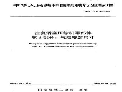 JB/T 2231.5-1999 本标准是对 ZB J72 012-87《往复活塞压缩机 气阀安装尺寸》进行的修订,主要技术内容改变如下: ——增加了“引用标准”GB 1801《公差与配合 尺寸至 500mm 孔、轴公差带与配合》; ——为防止进、排气阀错装,规定了气阀安装的有关安全要求。 本标准是 JB/T 2231《往复活塞压缩机零部件》系列标准的第 5 部分,该系列标准包括以下 5 个独立组成部分: JB/T 2331.1:轴、销外弃尺寸 JB/T 2331.2:气缸直径 JB/T 2331.3:薄壁轴瓦 JB/T 2331.4:环状阀片 JB/T 2331.5:气阀安装尺寸 本标准规定了往复活塞压缩机用环状和网状圆形气阀的安装尺寸的要求。 本标准适用于往复活塞压缩机环状和网状气阀。 本标准于 1977 年首次发布,1987 年第 1 次修订。 JB/T 2231.5-1999 往复活塞压缩机零部件 第 5 部分:气阀安装尺寸 JB/T2231.5-1999 标准下载解压密码:www.bzxz.net