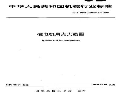JB/T 9865.1-1999 本标准是对 ZB J94 011.1-89《磁电机用点火线圈 技术条件》的修订,主要内容改变如下: ——增加了次级峰值电压检查;增加了初、次级绕组直流电阻和电感的检查;增加了浸水试验; ——取消了原标准中的冲击试验; 本标准规定了磁电机用点火线圈的技术要求,检验规则,标志、包装、运输及贮存。 本标准适用于各种用途(除航空外)的磁电机点火线圈的质量抽查、监督检验、新产品鉴定和委托检验。 本标准于 1989 年首次发布。 JB/T 9865.1-1999 磁电机用点火线圈 技术条件 JB/T9865.1-1999 标准下载解压密码:www.bzxz.net