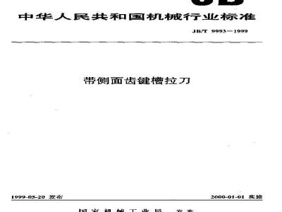 JB/T 9993-1999 本标准是对 ZB J41 009-89《带侧面齿键槽拉刀》的修订。修订时,删除了性能试验一章,并按有关规定进行了编辑性修改,其他技术内容未改变。 本标准规定了带侧面齿键槽拉刀的型式及尺寸,技术要求和标志包装的基本要求。 本标准适用于加工 GB/T 1095-1979《平键、键和键槽和剖面尺寸》中键槽宽度为 6~40mm,表面粗糙度为 Ra2.5μm轮毂槽的带侧面齿键槽拉刀。 本标准于 年 月 日首次发布。 JB/T 9993-1999 带铡面齿键槽拉刀 JB/T9993-1999 标准下载解压密码:www.bzxz.net