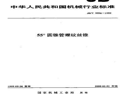 JB/T 9996-1999 本标准是对 ZB J41 013-89《55°圆锥管螺纹丝锥》的修订。修订时,删除了性能试验一章,并按有关规定进行了编辑性修改,其他技术内容未改变。 原标准非等效采用国际标准 ISO 2284-1987《圆柱和圆锥管螺纹手用丝锥 通用尺寸和标志》 本标准规定 55°圆锥管螺纹丝锥(以下简称丝锥)的型式和尺寸、牙型尺寸和偏差、技术要求、标志和包装的基本要求。并在附录 A (标准的附录)中给出了关于 Rc 系列丝锥总长及基准距离尺寸。 本标准适用于加工用螺纹密封的管螺纹(按 GB/T 7306-1987《用螺纹密封的管螺纹》)的丝锥 。 本标准于 年 月 日首次发布。 JB/T 9996-1999 55°圆锥管螺纹丝锥 JB/T9996-1999 标准下载解压密码:www.bzxz.net