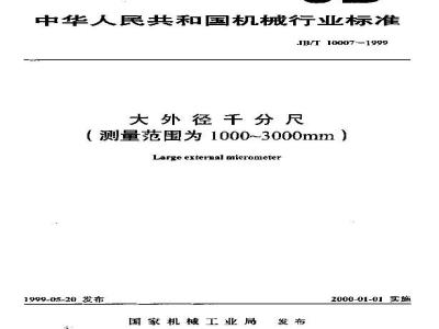 JB/T 10007-1999 本标准是对 ZB J42 004-87《大外径千分尺(测量范围为 1000mm 至 3000mm)》的修订,修订时仅按有关规定作了编辑必修改,主要技术内容未改变。 本标准规定了大外径千分尺的型式和尺寸,技术要求,标志与包装等。 本标准适用于分度值为 0.01mm、测微螺杆螺距为 0.5mm 或 1mm、量程为 25mm 或 50mm、测量范围为 1000~3000mm 的大外径千分尺。 本标准于 1987 年首次发布。 JB/T 10007-1999 大外径千分尺(测量范围为 1000mm~3000mm) JB/T10007-1999 标准下载解压密码:www.bzxz.net
