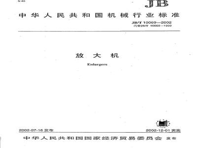 本标准是对JB/T100691999《放大机》的补充与修改。在制订本标准的过程中,主要依据有关国家标准增加有关技术采用的相关内容及国家标准对电气安全性能方面的强制性要求,以使标准的技术指标具有先进性和合理性,促进产品质量的提高,既符合生产实际,又能满足客户的使用要求。本标准与JB/T10069—1999相比主要变化如下:-本标准对原来主要适用于黑白相纸《放大机》标准补充了GB10971一1989《彩色混色头》的内容,使之同时适用黑白、彩色相纸放大的技术要求。一本标准对放大机中采用的镜头连接螺纹规格,根据国际上常用的放大镜头螺纹系列作了补充。JB/T10069一1999中的3.1.1绝缘电阻不小于2MQ改为4.17.3接地性能。本标准由中国机械工业联合会提出。本标准由全国照相机械标准化技术委员会归口。本标准起草单位:上海八一精密机械有限公司、杭州照相机械研究所。本标准主要起草人:翟纪明、李慎谱、冯关森。1范围