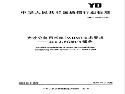 本标准规定了32×2.5Gbit/s 的WDM系统的技术要求,针对采用共享掺铒光纤放大器DEFA技术和光纤1550nm窗口的密集波分复用系统。它的目标是将来提供不同系统间的横向兼容性,目前则只能达到部分横向兼容目的。本标准给出的某些具体参数针对32通路WDM系统,如波长区划分、光接口参数等,本标准中有关光放大器和主光通道的参数适用于单方向使用增益范围为192.1THz~1996.1THz的光放大器的WDM系统。本标准规范的是点到点线性WDM系统和在OADM应用于线性结构的要求,不考虑OADM设备在环网中的应用。本标准适用于32×2.5Gbit/s 的WDM系统,即以SDH STM-16速率为基础的干线网32通路单纤单向WDM系统的应用,承载信号为其它数字格式或速率的WDM系统可参照执行。本标准规定的光接口参数指标适用于零色散窗口为1310nm的常规G.652光缆系列,对非零色散位移(G.655)光缆系统可以参照执行。 YD/T 1060-2000 光波分复用系统(WDM)技术要求——32×2.5Gbit/s部分 YD/T1060-2000 标准下载解压密码:www.bzxz.net