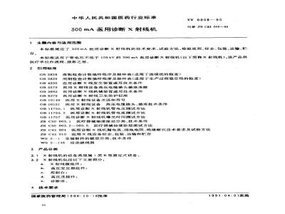 本标准适用于管电压不低于100kV的300mA医用诊断×射线机(以下简称X射线机)。该产品供医疗单位作透视、摄影之用。
