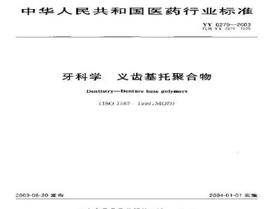 本标准对义齿基托聚合物和共聚物进行了分类,规定了要求及试验方法,并对产品的包装、标志及使用说明书的要求进行了规定。 YY 0270-2003 牙科学-义齿基托聚合物 YY0270-2003 标准下载解压密码:www.bzxz.net