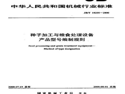 3.2种子加1与粮食处理设备产品的人类代号一准为5,型号前部分的学符总数为2-5个。:3.3在B门854的基研础上,对产品型号前部分的小类分类代号与特征代号,补充规定如下,3.3.1对J3.T8574中没有列出的产品,取其产品名称辨音字付中的一至两个字母作为小类分类代号遵行端,以不4中第5人我见采用的使与重复,不与其它机其发生混滑为原则。其中,)对子加工机械中的洁选机越,在5X后进行续编,如:国家机械工业扇2000-07-19批准2000-08-01实施