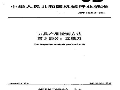 JB/T 10231.3-2001 本标准规定了各种立铣刀成品检测时的检测方法和检测器具,这此致方法并非唯一。 本标准适用于按GB/T 6117.1~6117.3、GB/T 6118、GB/T 1109生产的立铣刀的检测。 本标准于2001年3月首次发布。 JB/T 10231.3-2001 刀具产品检测方法 第1部分:立铣刀 JB/T10231.3-2001 标准下载解压密码:www.bzxz.net