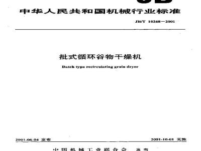 JB/T 10268—2001 本标准规定了以加热空气为干燥介质的批式谷物干燥机的型式、型号,主要参数,技术要求,试验方法,检验规则,标志、包装及贮存等。 本标准适用于以干燥水稻为主,兼烘小麦、玉米的循环式干燥机的设计、制造、试验、验收。 本标准于2001年6月首次发布。 JB/T 10268-2001 批式循环谷物干燥机 JB/T10268-2001 标准下载解压密码:www.bzxz.net