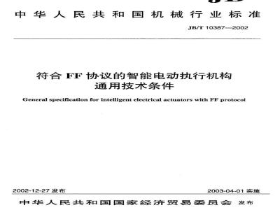 本标准规定的符合FF协议的智能电动执行机构的生要技术指标参照有关FF协议产品技术资料。本标准的产品性能评定方法,主要参照JB/T8219一1999《工业过程测量和控制系统用电动执行机构》等标准规定编制。另外还规定了智能功能的技术要求和评定方法。本标准的结构、技术要素及表述按GB/T1.12000和GB/T1.22002的要求编写。本标准由中国机械工业联合会提出。本标准由全国工业过程测量和控制标准化技术委员会归口。本标准由重庆工业自动化仪表研究所负责起草,上海自动化仪表股份有限公司技术中心、吴忠仪表股份有限公司、天津市自动化仪表七厂参加起草。本标准主要起草人:孟鸿勋、刘琴、丁洁、丁成卫、王双存。1范围