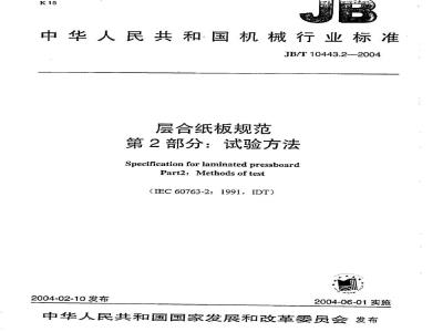JB/T10443《层合纸板规范》分为三个部分:-第1部分:定义、分类和一般要求;一第2部分:试验方法: