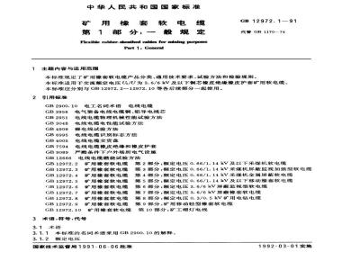 本标准规定了矿用橡套软电缆产品分类、通用技术要求、试验方法和检验规则。本标准适用于交流额定电压U./U为3.6/6kV及以下铜芯橡皮绝缘橡皮护套矿用软电缆。本标准应分别与GB12972.2~12972.10等各后续部分一起使用。2引用标准
