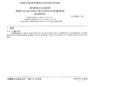 本规范规定了3DK103型NPN硅小功率开关品送管《以下简称器件)的详细婴求,每独器件按GTB33半导体分立器件总规范的规定,提供产用保证的三个等级(GP.GT和GCT级)。