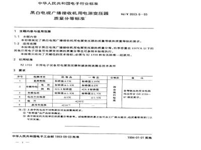 本标准适用于黑白电视广播接收机用电源变压器的质量分等.功率容量在100VA以下的其他日用电子设备用电源变压器的质量分等也可参照本标准执行。本标准只给出了关键性的技术指标,必须与SJ1759和有关标准一起使用。2引用标准