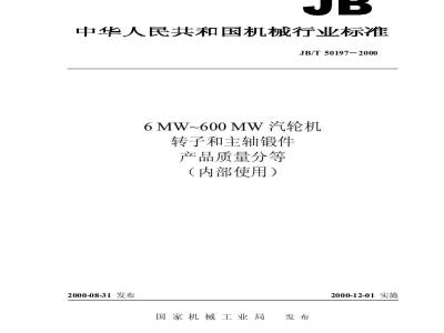 JB/T 50197-2000 6MW~600MW汽轮机转子和主轴锻件 产品质量分等 JB/T50197-2000 标准下载解压密码:www.bzxz.net