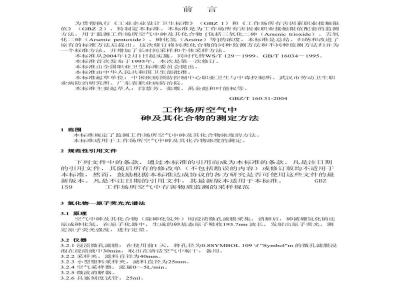 为贯彻执行《工业企业设计卫生标准》(GBZ1)和《工作场所有害因素职业接触限值》(GBZ2),特制定本标准。本标准是为工作场所有害因素职业接触限值配套的监测方法,用于监测工作场所空气中砷及其化合物【包括三氧化二砷(Arsenictrioxide)、五氧化二砷(Arsenicpentoxide)、砷化氢(Arsine)等的浓度。本标准是总结、归纳和改进了原有的标准方法后提出。这次修订将同类化合物的同种监测方法和不同种监测方法归并为一个标准方法,并增加了长时间采样和个体采样方法本标准从2004年12月1日起实施。同时代替WS/T129一1999、GB/T16034一1995。本标准首次发布于1995年,本次是第一次修订。本标准由全国职业卫生标准委员会提出。本标准由中华人民共和国卫生部批准。本标准起草单位:中国疾病预防控制中心职业卫生与中毒控制所、武汉市劳动卫生职业病防治研究所、广东省职业病防治院本标准主要起草人:闫慧芳、张敬、禹金彪和叶能权等。GBZ/T160.31-2004