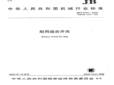 本标准规定了船用组合开关的型号、规格、标志、正常工作条件、技术要求、试验、包装、运输及贮存。 JB/T 5791-2002 船用组合开关 JB/T5791-2002 标准下载解压密码:www.bzxz.net
