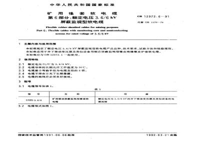 本标准规定了额定电压3.6/6kV屏蔽监视型软电缆产品品种、技术要求、试验方法和检验规则。本标准适用于井下移动变压器及类似设备用铜芯屏蔽监视型橡皮绝缘橡皮护套软电缆。本标准应与GB 12972.1一起使用。 GB 12972.6-1991 矿用橡套软电缆 第6部分:额定电压0. 66/1.14 kV及以下移动橡套软电缆 GB12972.6-1991 标准下载解压密码:www.bzxz.net