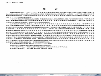 本标准待测液采用湿灰化法(硝酸-高氯酸消煮法),该法硝酸沸点低,与有机质作用后,不致使元索损失,高氯酸是强氧化剂,可加速消煮速度及使硅脱水,消煮后待测液可同时测定12种元素,并适应于比色法、火焰光度法和原子吸收分光光度法的测定。硅的测定采用灼烧-质量法。铁的测定采用邻菲啰啉比色法和原子吸收分光光度法。邻菲啰啉比色法反应在弱酸性条件下进行,显色液颜色稳定、鲜明;原子吸收分光光度法可直接用待测液在仪器上测定,操作简便、快速。铝的测定采用铝试剂比色法,不用加热,显色液额色鲜明,操作简便。钙、镁的测定采用EDTA络合滴定法和原子吸收分光光度法。EDTA络合滴定法准确度较高,手续简便、快速,不需要特殊仪器设备,适用于一般实验室中大批样品测定;原子吸收分光光度法干扰少、灵敏度高、简便快速。钾、钠的测定采用火焰光度法,待测液可不作任何处理,直接在仪器上测定,操作简便、快速。磷的测定采用钼抗比色法,颜色稳定,操作简便。硫的测定采用硫酸钡比法,其优点是操作简便,但必须严格遵守操作条件,测定结果才能稳定可靠。锰的测定采用甲醛污比色法和原子吸收分光光度法。甲醛污比色法可取待测液直接显色,不必除去氯离子,操作简便;原子吸收分光光度法,待测液不必作任何处理可直接上仪器测定,操作简便、准确。铜的测定采用原子吸收分光光度法,待测液不必作任何处理,可直接上仪器测定,简便且快速,是一种较理想的测铜方法。锌的测定采用原子吸收分光光度法,灵敏度与准确度较高,极为简便、快速,是一种满意的测锌方法。自本标准实施之日起,原GB/T7887一1987作废。本标准由中国林业科学研究院林业研究所归口。本标准起草单位:中国林业科学研究院林业研究所森林土坡研究室。本标准主要起草人:张万儒、杨光滢、屠星南、张葬。1范围