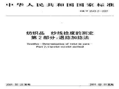 Textilex -eterminution of iwist InyarnPart 2.l'ntwist-retwist method本标价规定了使用退持加培法测定纱战的均问除度的方讼,GD/T2543.2—2001
