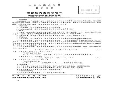 4.1寿命试验在一般情况下,试验应力水平应当是元器件技术标准中规定的额定值。4.2加速寿命试验在没有获得加速系数的情况下,一个完整的加速寿命试验其应力水平应不少于四个。为保证试验的准确性,最高应力和最低应力之间应有较大的间隔。其中一个应力水平应接近或等于该产品技术标准中规定的额定值。最高应力水平不得大于该产品的结构材料、制造工艺所能承受的极限应力,以免带进新的失效机理。4.3应力水平的间隔为提高试验的准确性,应适当选择应力水平的间隔。例如,当采用温度应力时,其间隔为: