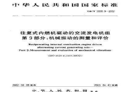 本部分描述了在规定测量点对发电机组的外部机械振动特性进行测量和评价的程序。本部分适用于由往复式内燃机驱动的、固定式和移动式、刚性和(或)弹性安装的交流发电机组。本部分适用于陆用和船用发电机组,不适用于航空或驱动陆用车辆和机车的发电机组。对于某些特殊的发电机组(如医院、高层建筑的供电等),有必要提出一些补充要求。本部分的有关规定可作为基矗对于由其他往复式发动机(如沼气发动机、蒸汽机等)驱动的发电机组,本部分的规定也可作为基矗 GB/T 2820.9-2002 往复式内燃机驱动的交流发电机组 第9部分:机械振动的测量和评价 GB/T2820.9-2002 标准下载解压密码:www.bzxz.net