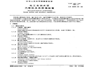 本标准主要供制订标准,编订技术文件、编写和翻译专业手册、教材及书刊使用。本标准规定了汽轮机及其附属装置的专用名词术语,与汽轮机及其附属装置有关的各类标准中使用的名词术语,必须符合GB2900.1一82《电工名词术语基本名词术语》、本标准和有关电工各专业名词术语国家标准。凡上述标准中未作规定的名词术语,可在各类标准和技术文件中给予规定。1汽轮机