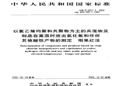 本标准规定了以氯乙烯均聚和共聚物(以下简称PVC)为主的共混物及制品在高温时放出氯化氢和任何其他酸性产物的测定方法。本标准适用于以PVC为主要成分的共混物及制品,不适用于在干混下形成的混合物。本方法可以用于表征PVC共混物及制品的热稳定性。本方法适用于在加热过程中褪色试验不能令人满意的有颜色PVC共混物和制品。 GB/T 2917.1-2002 以氯乙烯均聚和共聚物为主的共混物及制品在高温时放出氯化氢和任何其他酸性产物的测定 刚果红法 GB/T2917.1-2002 标准下载解压密码:www.bzxz.net