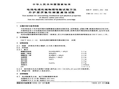 本标准规定了外护层太氧性细菌腐蚀试验的试验设备、试样制备、试验步骤、数据处理和结果分析。本标准适用于对比检验用非水溶性防腐剂处理后的麻、纸等天然纤维材料的防腐效果,也可作为其他纤维材料的耐菌性对比试验之用。电线电缆机械物理性能试验的一般规定、定义和试验设备的定期校验等规定在GB/T 2951.1中。 GB/T 2951.25-1994 电线电缆机械物理性能试验方法 外护层厌氧性细菌腐蚀试验 GB/T2951.25-1994 标准下载解压密码:www.bzxz.net