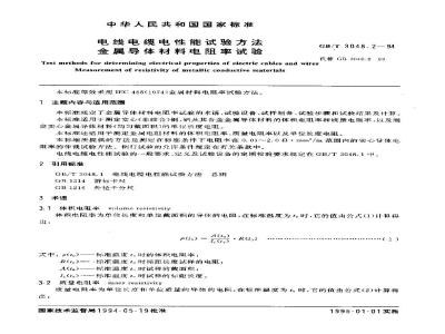 本标准规定了金属导体材料电阻率试验的术语、试验设备、试样制备、试验步骤和试验结果及计算。本标准适用于测定实心(非绞合)铜、铝及其合金金属导体材料的体积电阻率和质量电阻率,以及测定实心金属导体材料(均匀截面积)的单位长度电阻。本标准还适用于测定金属电阻材料的体积电阻率、质电阻率以及单位长度电阻。本标准所提供的方法是测定在标准条件下电阻率在0.01~2.0n·mm2/m范围内的实心导体电阻率的仲裁试验方法。例行试验的允许条件规定在有关条款中。电线电缆电性能试验的-一般要求,定义及试验设备的定期校验要求规定在GB/T3048.1中,2引用标准