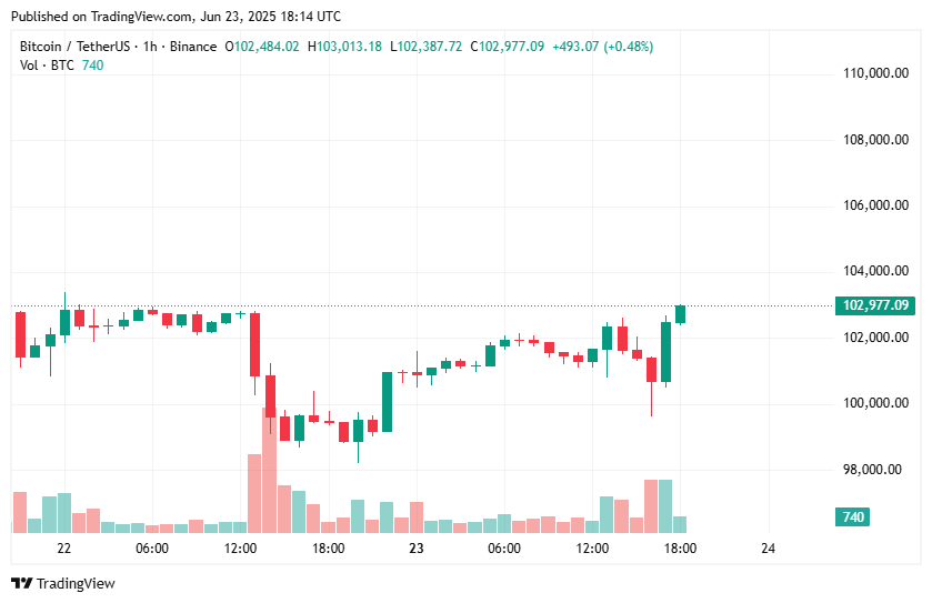 在伊朗向卡塔尔美军基地发射导弹的消息引发比特币价格暴跌后,其迅速反弹至10.3万美元上方。