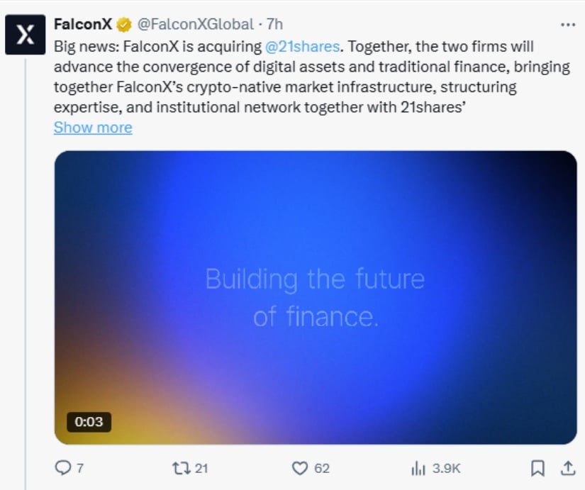 此次收购标志着加密货币ETP领域最重大的交易之一,也是FalconX在2025年完成的第三笔重磅交易。