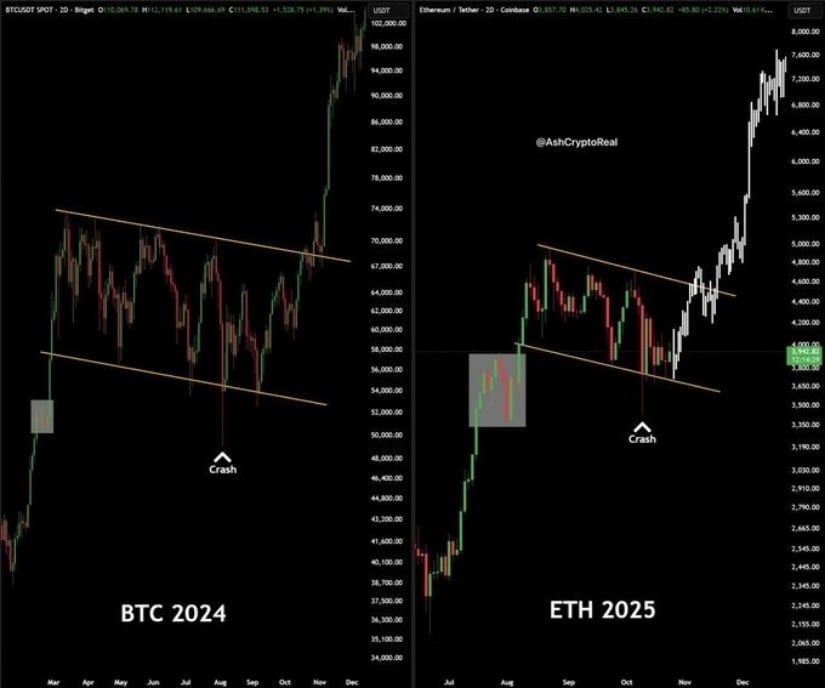 加密货币分析师Kamran Asghar在X平台指出:"以太坊正在复刻去年比特币减半后的暴涨走势。若历史重演,$ETH可能在12月触及7,000-8,000美元!谁准备好迎接这波行情了?"