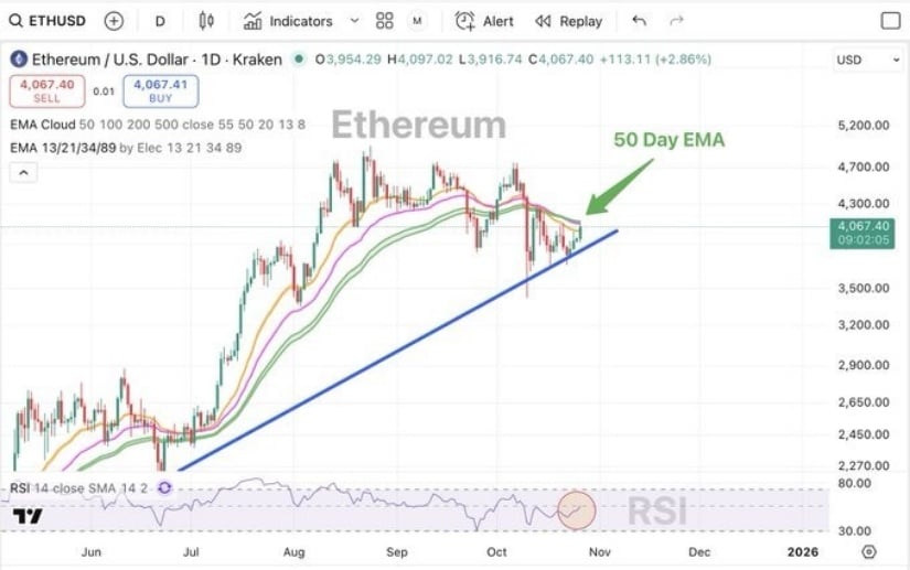 以太坊测试关键RSI与50日EMA指标,多头保持乐观。来源:@Crypto_Twittier via X