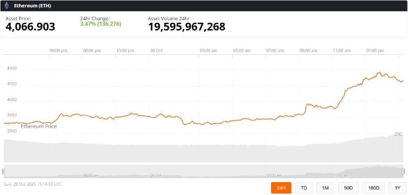 本文发布时,以太坊(ETH)交易价格约4,066美元,24小时涨幅3.47%。来源:Brave New Coin以太坊价格