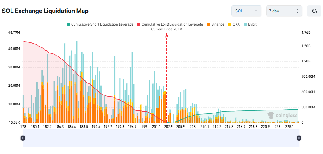 但链上数据显示,交易所SOL储备自十月初持续攀升,表明持有者抛售意愿增强,价格闪崩风险加剧。若SOL跌至178美元,多头清算规模或达16亿美元;反之若涨至225美元,空头清算金额约2.6亿美元。